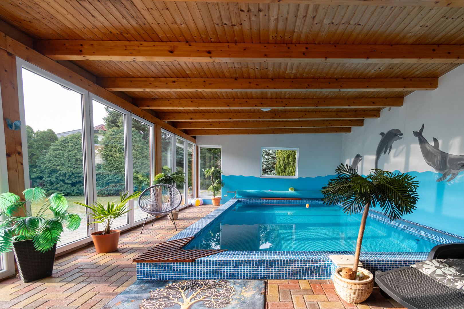 Az ingatlan egyik kiemelkedő adottsága a mintegy 45 m²-es beépített teraszon kialakított belső úszómedence, amely egész évben biztosítja a kényelmes, privát wellness lehetőségét.